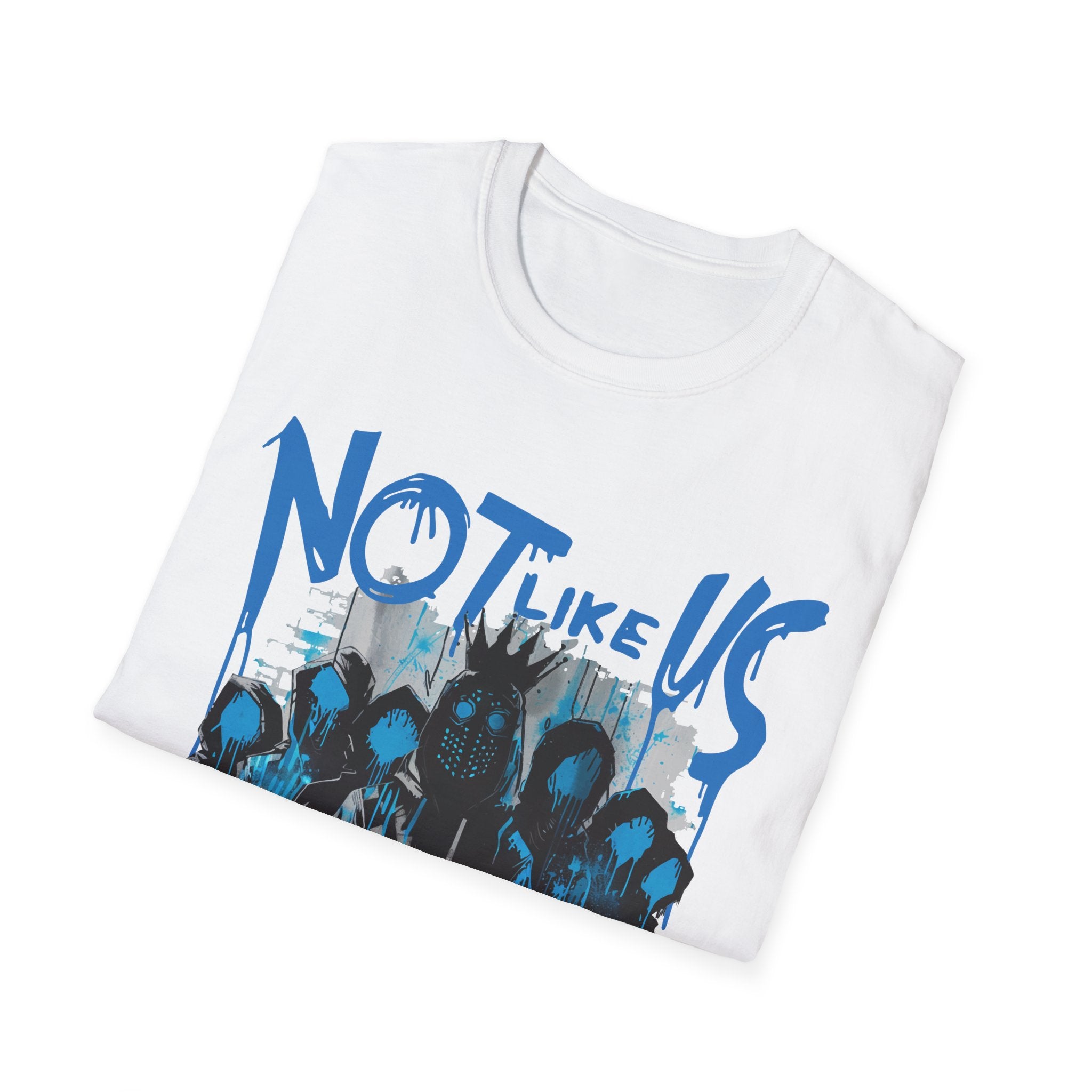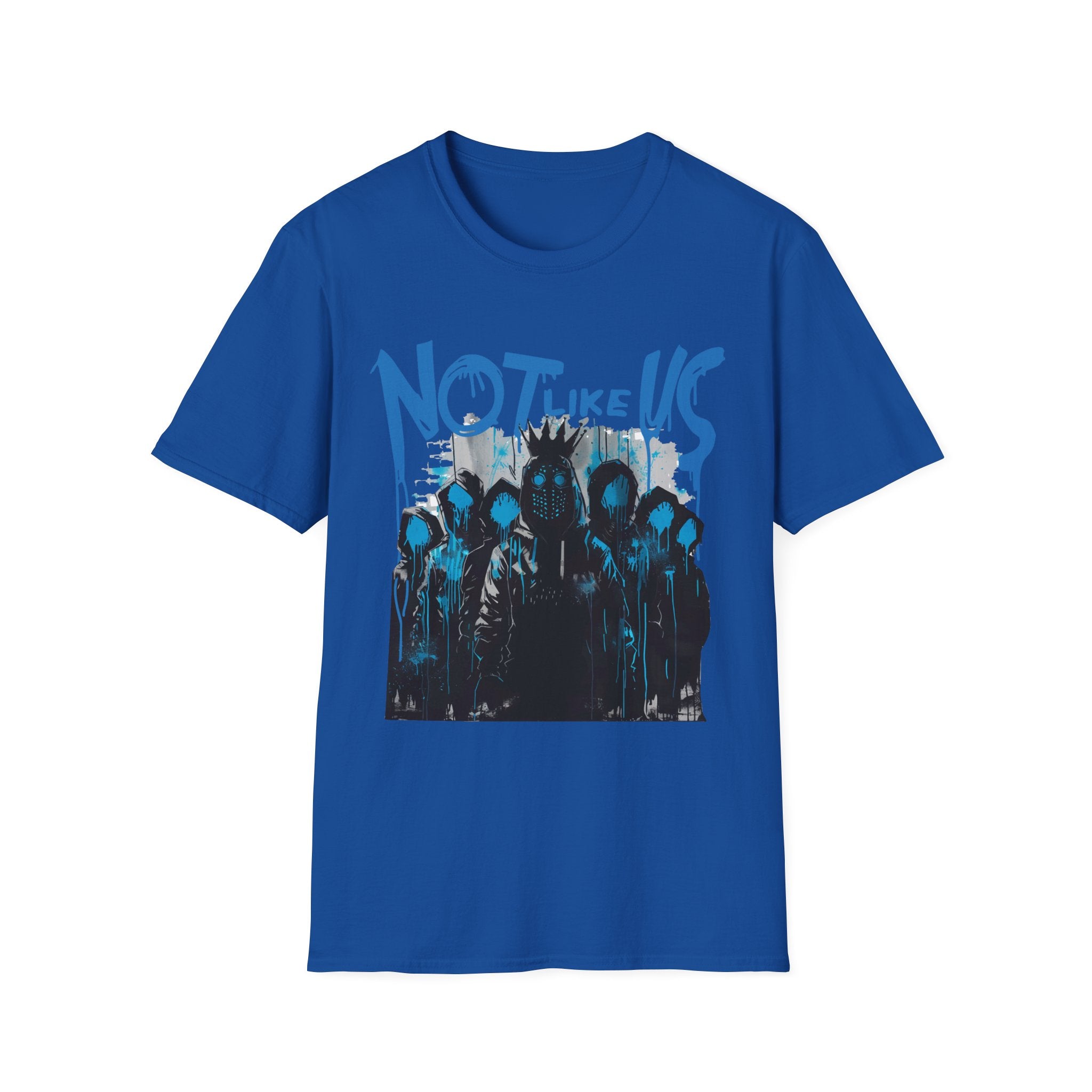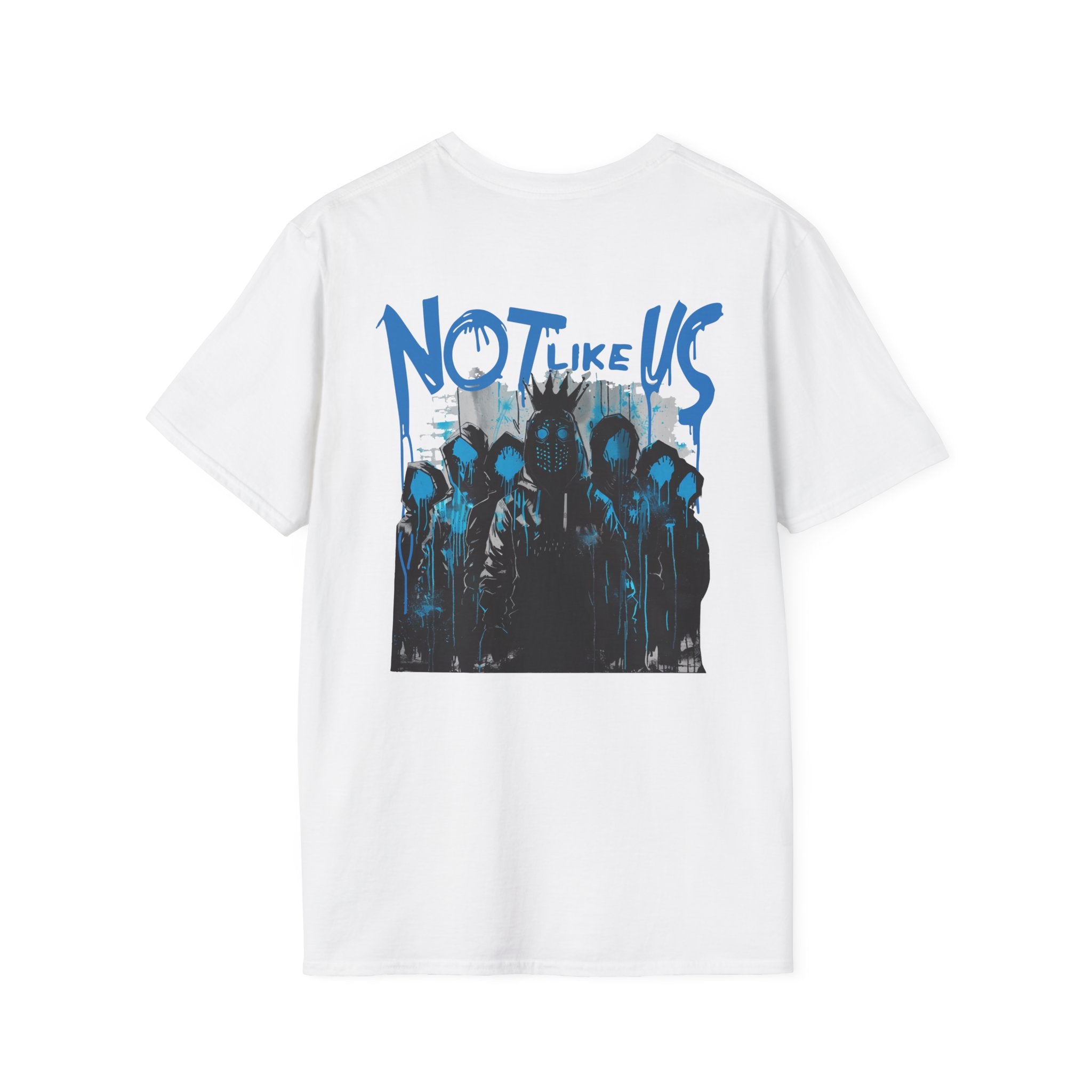 This lightweight cotton tee carries a bold, urban-art energy — a crowd of shadowed figures crowned in blue, stamped with the hand-painted slogan “NOT LIKE US.” It feels like a midnight protest painted onto soft, breathable fabric: comfortable enough for long days, but visually striking enough to start conversations. Wear it when you want to lean into outsider confidence, roam the city, or layer under a jacket for a raw, streetwise look.