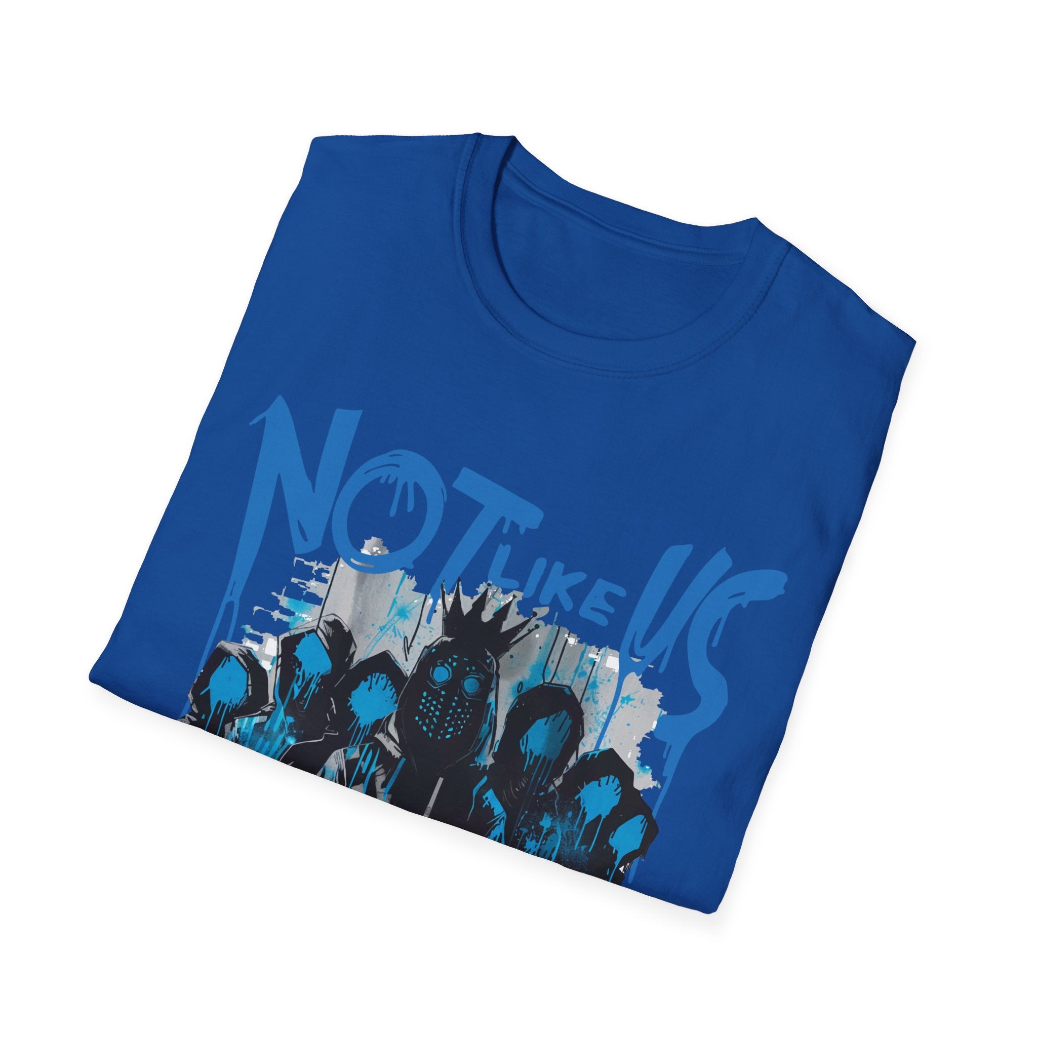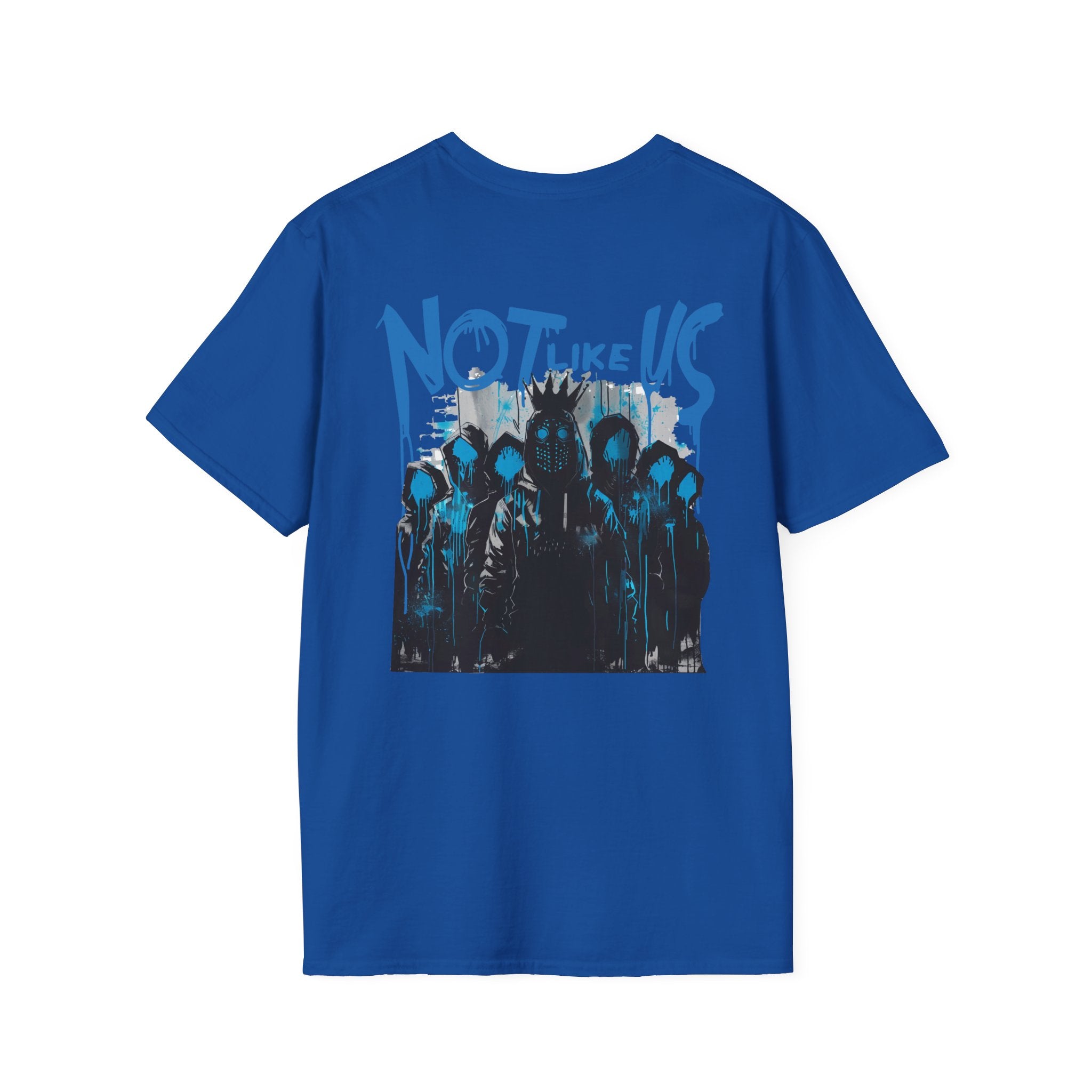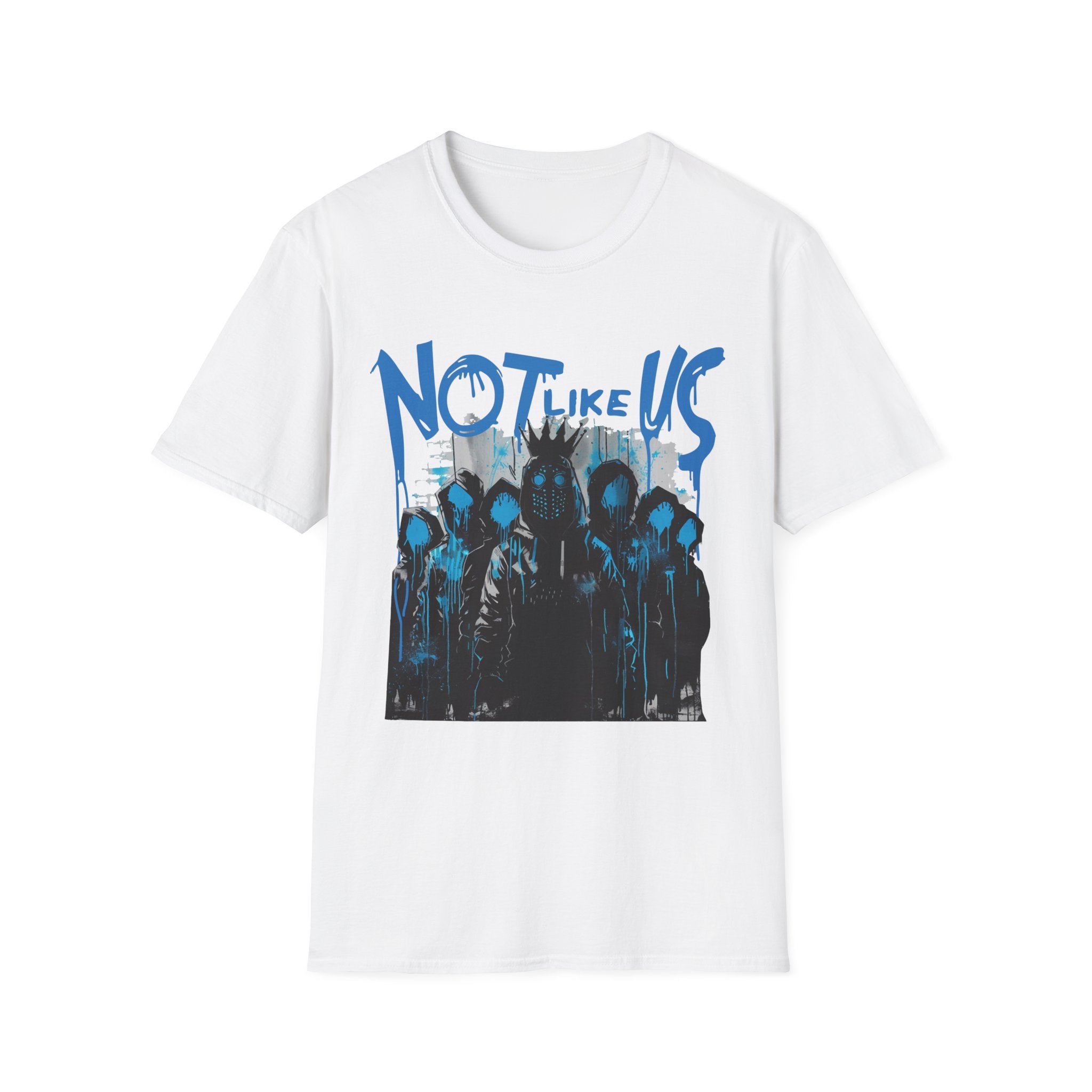 This lightweight cotton tee carries a bold, urban-art energy — a crowd of shadowed figures crowned in blue, stamped with the hand-painted slogan “NOT LIKE US.” It feels like a midnight protest painted onto soft, breathable fabric: comfortable enough for long days, but visually striking enough to start conversations. Wear it when you want to lean into outsider confidence, roam the city, or layer under a jacket for a raw, streetwise look.